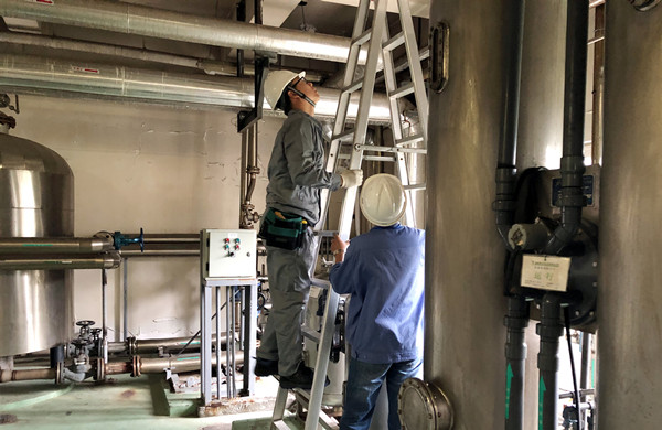 6月25日,高空灯具更换竞赛开始,参赛队伍共四组,按抽签顺序进行比赛,比赛内容是软化水间老旧灯具更换。